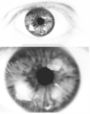 Die Iris nimmt ungefähr ein Drittel der Augenlänge ein. Ihr individuelles Aussehen unterscheidet sich deutlich in Farbe und Struktur von Mensch zu Mensch. Einheitlich ist bei fast allen Augen ein dunkler werdender Verlauf zum Außenrand und eine strahlenförmige Anordnung der Iris zur Pupille hin.